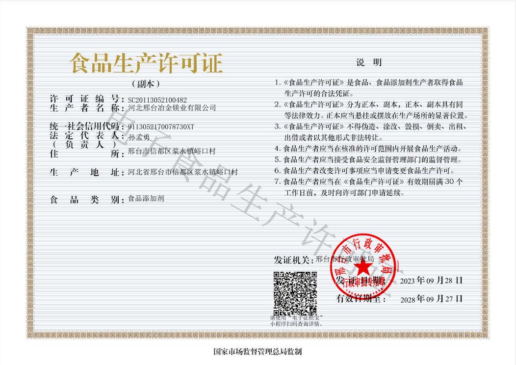 冶金鎂業(yè)食品生產(chǎn)許可證副本