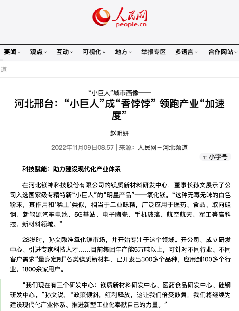 人民網(wǎng)報道!“小巨人”鎂神